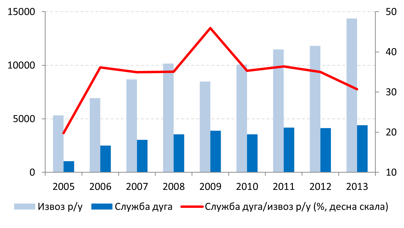 Još jedan indikator eksterne zaduženosti ili solventnosti ekonomije koji se često koristi jeste indikator službe duga u odnosu na izvoz roba i usluga. On pokazuje koliki deo obaveza po osnovu duga (glavnica + kamata) se pokriva iz ostvarenih prihoda po osnovu izvoza roba i usluga. Prema kritičnim vrednostima indikatora (30-50%) očigledno je da se srpska ekonomija nalazi u grupi zemalja koje su visoko zadužene.