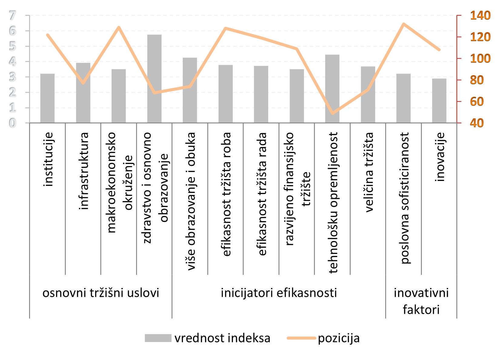 Each year, the World Economic Forum (the Davos Economic Summit) ranks countries according to the Global Competitiveness Index (GCI), which consists of three sub-indices: (1) basic requirements (index value 4.10, rank 101), (2) efficiency enhancers (index value 3.90, rank 80), and (3) innovation and sophistication factors (index value 3.05, rank 121). The GCI is fundamentally based on 12 pillars: institutions, infrastructure, macroeconomic environment, health and primary education, higher education and training, goods market efficiency, labor market efficiency, financial market development, technological readiness, market size, business sophistication, and innovation. Serbia achieves its best results in the areas of health and primary education, technological readiness, and higher education and training, while it records very poor performance in innovation and institutions, both in terms of index values and country rankings.