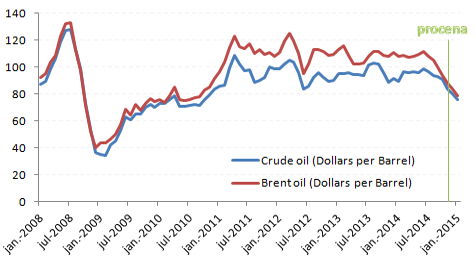 Svetska cena nafte je u postepenom padu od juna 2014. godine. Najveći zabeleženi pad je početkom oktobra. Brent nafta beleži pad cena, u odnosu na početak septembra od skoro 7$ po barelu, dok je laka nafta zabeležila pad od skoro 2$ po barelu. Očigledno je da je uzrok pada cena nafte slaba tražnja za naftom i/ili prevelika ponuda nafte. Slaba tražnja za naftom je posledica niskog rasta svetske ekonomije (otuda poslednja korekcija MMF i SB za rast svetske privrede u 2014. na 3,3%), pa neravnoteža na tržištu nafte (usled rastuće ponude) utiče na pad cene nafte.