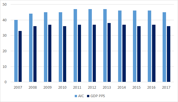 Ten EU Member States recorded AIC per capita above the EU average in 2017. The highest level was observed in Luxembourg, 32% above the EU average, followed by Germany (22%), Austria (17%), the United Kingdom and Denmark (14%), Finland and Belgium (12%), the Netherlands (11%), Sweden (9%), and France (8%) above the EU average. Since 2013, all of these economies have experienced a continuous decline in household individual consumption. Similar trends can be observed in GDP per capita (a measure of economic activity), although the United Kingdom and Finland deviate slightly, exhibiting higher consumption relative to GDP measured in PPS compared to the other listed economies.