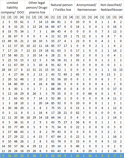 Napomene: „0%“ je prikazano u tabeli, što znači da je to zanemarljivo mali udeo, a ne bukvalno nula procenata