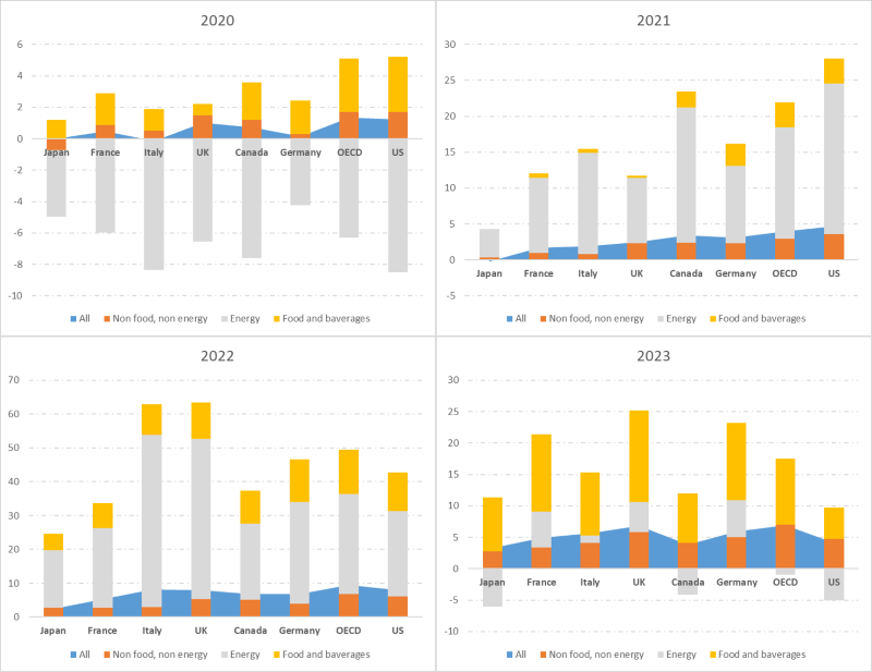Globalni tokovi u periodu 2020-2023. godina pokazali su značajnu ulogu cene energenata u formiranju opšteg nivoa cena ili inflacije G7 zemalja. U periodu 2020-2022. godina inflacija je vođena cenama energenata, usled rastuće neravnoteže na tržištu nafte, cena naftnih fjučersa na finansijskom tržištu, kao i cena transporta nafte i osiguranje transporta. Međutim, bazna inflacija i cene hrane i bezalkoholnih pića su značajno doprinele da se inflacija ubrza tokom 2022. i 2023. godine. Cena bez hrane i energenata (bazna inflacija) uglavnom je stabilna, ali povišena. Ona je visoka i u svim razvijenim zemljama EU – u Nemačkoj iznad 5% (veća za 1 procentni poen u odnosu na 2022. godinu), u Francuskoj 4,2% (veća za 1,2 procentna poena), u Italiji 3,4% (veća za 0,6 procentnih poena). Još 12 zemalja OECD-a beleže rast bazne inflacije u ovom periodu (SAD 4,8%, VB 5,8%). Na visoke cene hrane i bezalkoholnih pića delom su uticale ranije ukalkulisane cena energenata, ali i rastući troškovi u lancu snabdevanja (cene, marže, sirovine, penali, osiguranje).