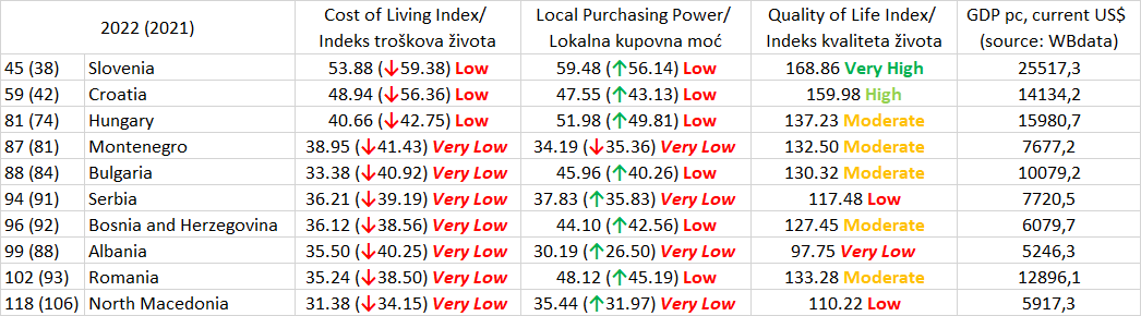 Indeks troškova života država u okruženju (Cost of Living Index of the neighbouring countries)